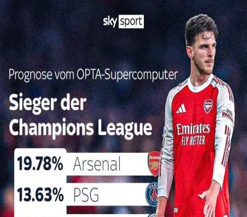 Opta预测欧冠夺冠概率前5:阿森纳第1,巴黎第2,曼城第3