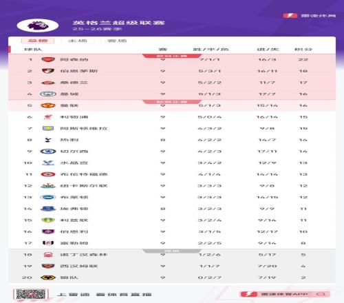 雷速体育10月27报道 新赛季英超联赛来到第9轮,阿森纳继续领跑积分榜,但在积分榜紧追阿森纳的却不是利物浦、曼城、切尔西等豪门,而是伯恩茅斯、桑德兰。