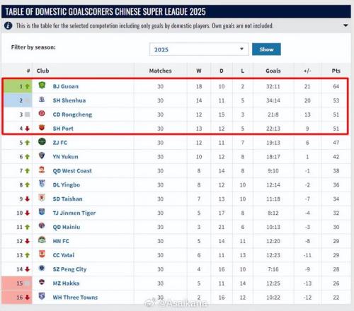 2025赛季中超联赛已经闭幕,各队有喜有忧,上海海港喜捧冠军奖杯,申花再度屈居第二无缘冠军,同样有些失落的还有北京国安和成都蓉城,联赛期间他们也一度离火神杯最近。在中超,想夺冠,外援是决定性因素 。近日,德转管理员朱艺做了一份表单,抛开外援和港澳台球员后,依靠纯本土球员进球而得到的联赛排名显示(下图),北京国安变冠军,申花第2蓉城第3。