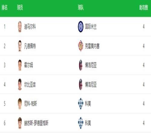 此外,他还以4次助攻与迪马尔科、凡德佩特、霍尔姆、坎比亚吉以及队友赫苏斯-罗德里格斯并列意甲助攻榜榜首。