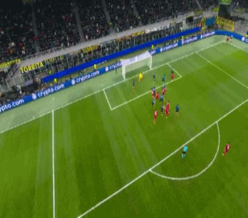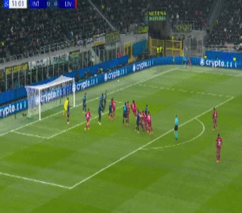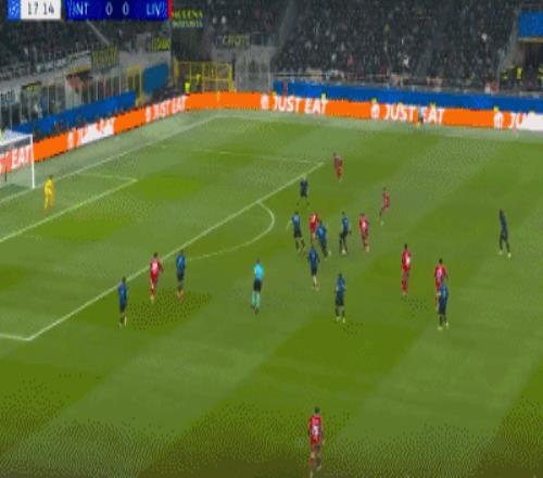 上半场补时第6分钟,巴斯托尼左路传中,落点恰到好处,劳塔罗力压范戴克头槌攻门,阿利松回敬精彩扑救,利物浦险些压哨丢球。